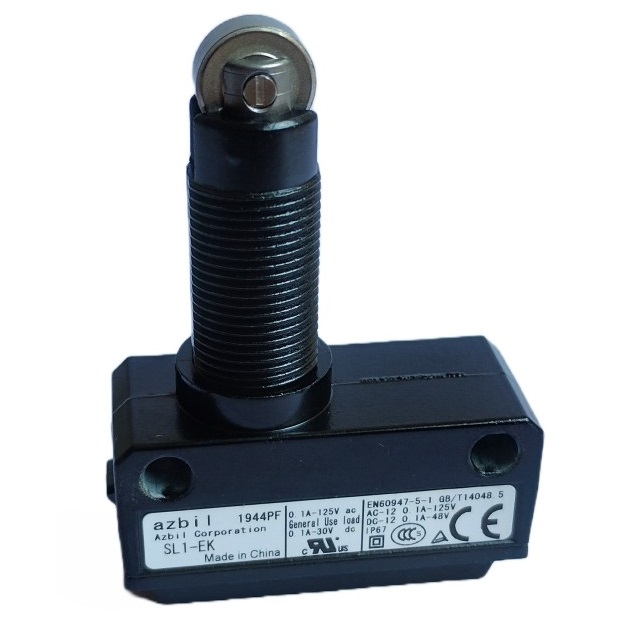 The SL1-EK is a 1-pole compact Limit Switch with roller plunger actuator. Limit Switches are sealed, sensitive and have a long life. The compact size makes them suitable for the total miniaturization of machinery or equipment.